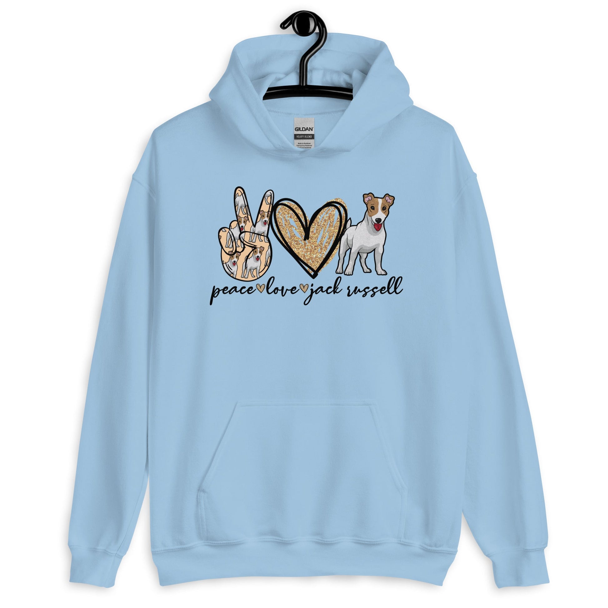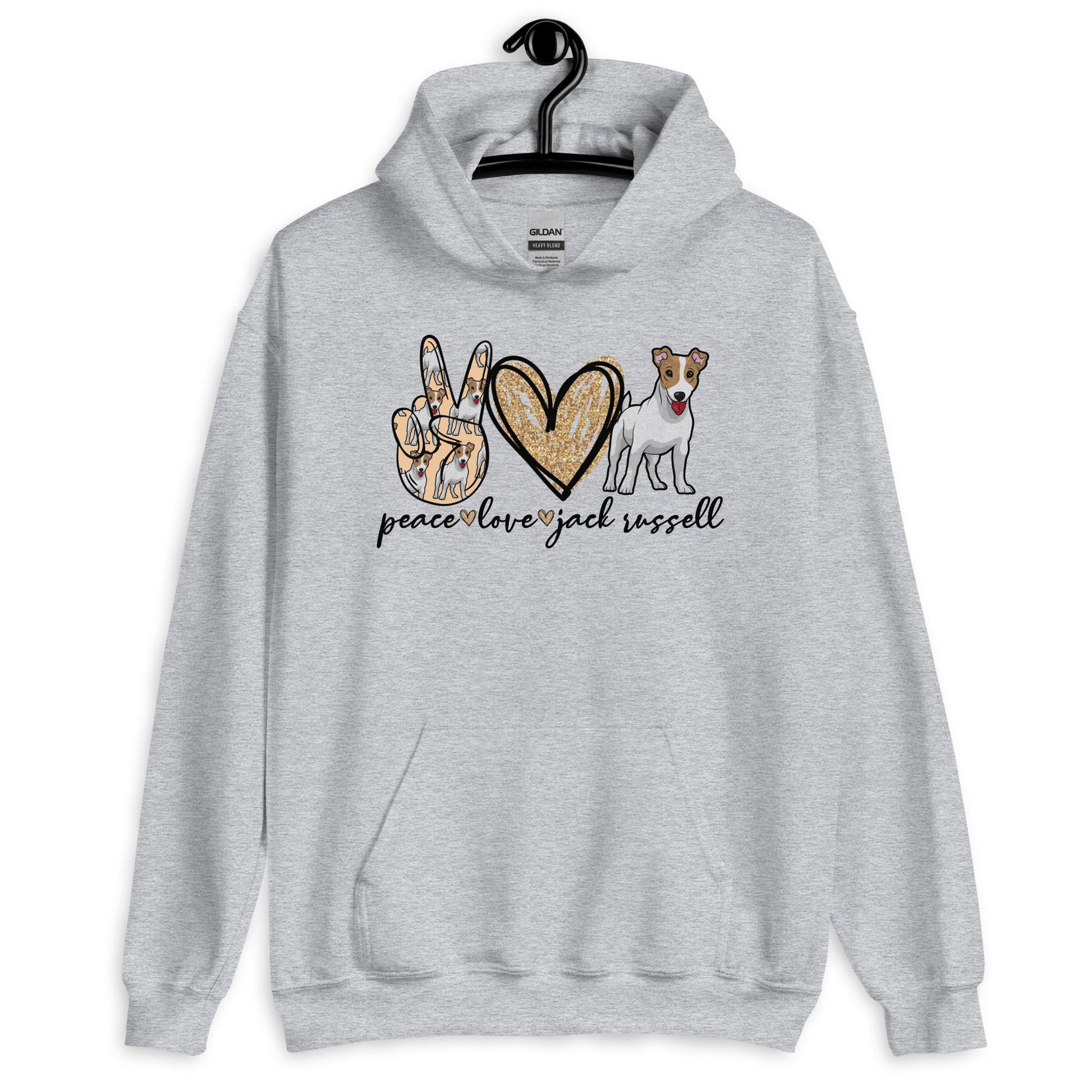 Peace Love Jack Russell Unisex Hoodies are printed in USA