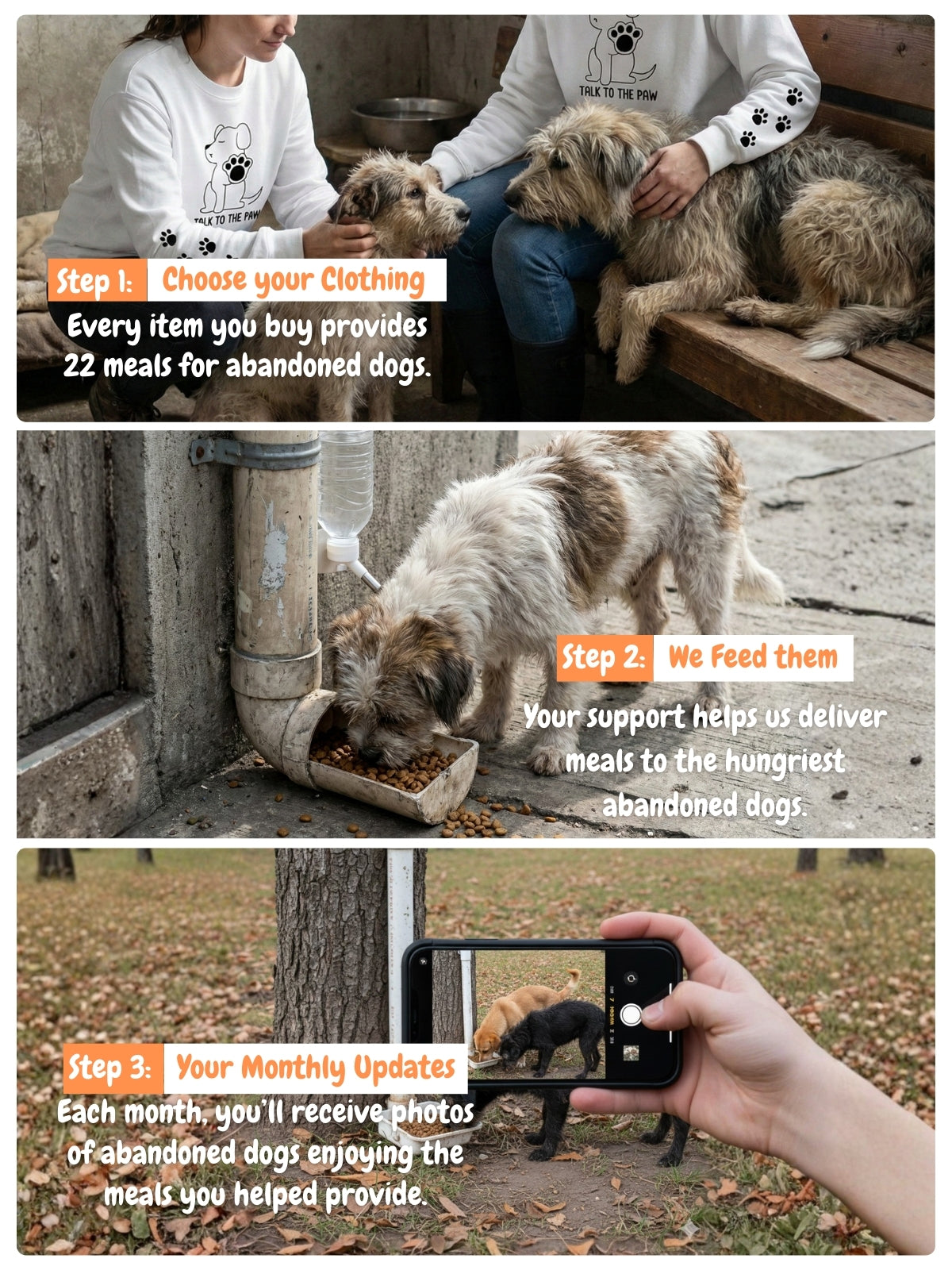 We're a small passionate team on a huge mission. Every item truly feeds 22 abandoned dogs—and you'll see the proof within 30 days.