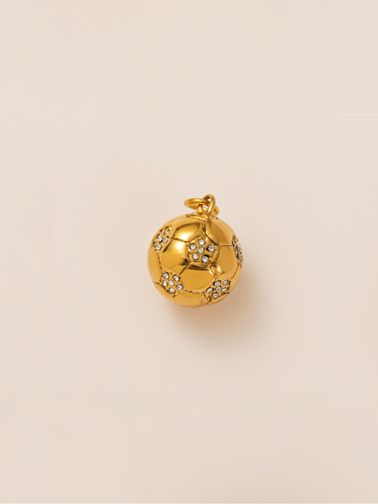 A golden soccer ball charm that celebrates joyful memories of playing with your pup.